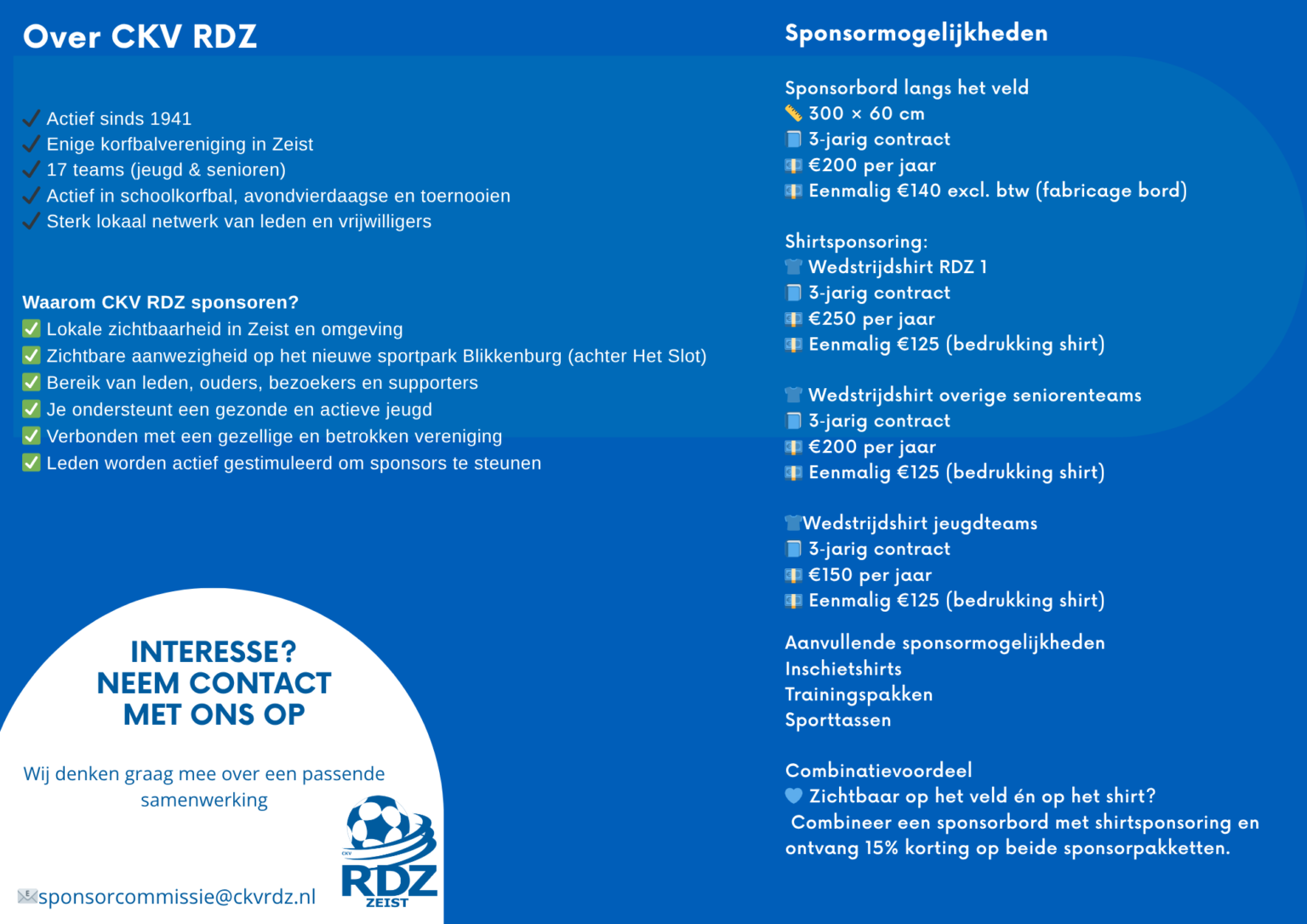 Door CKV RDZ te sponsoren vergroot je de lokale zichtbaarheid van jouw bedrijf én ondersteun je een gezonde, sportieve jeugd in Zeist
