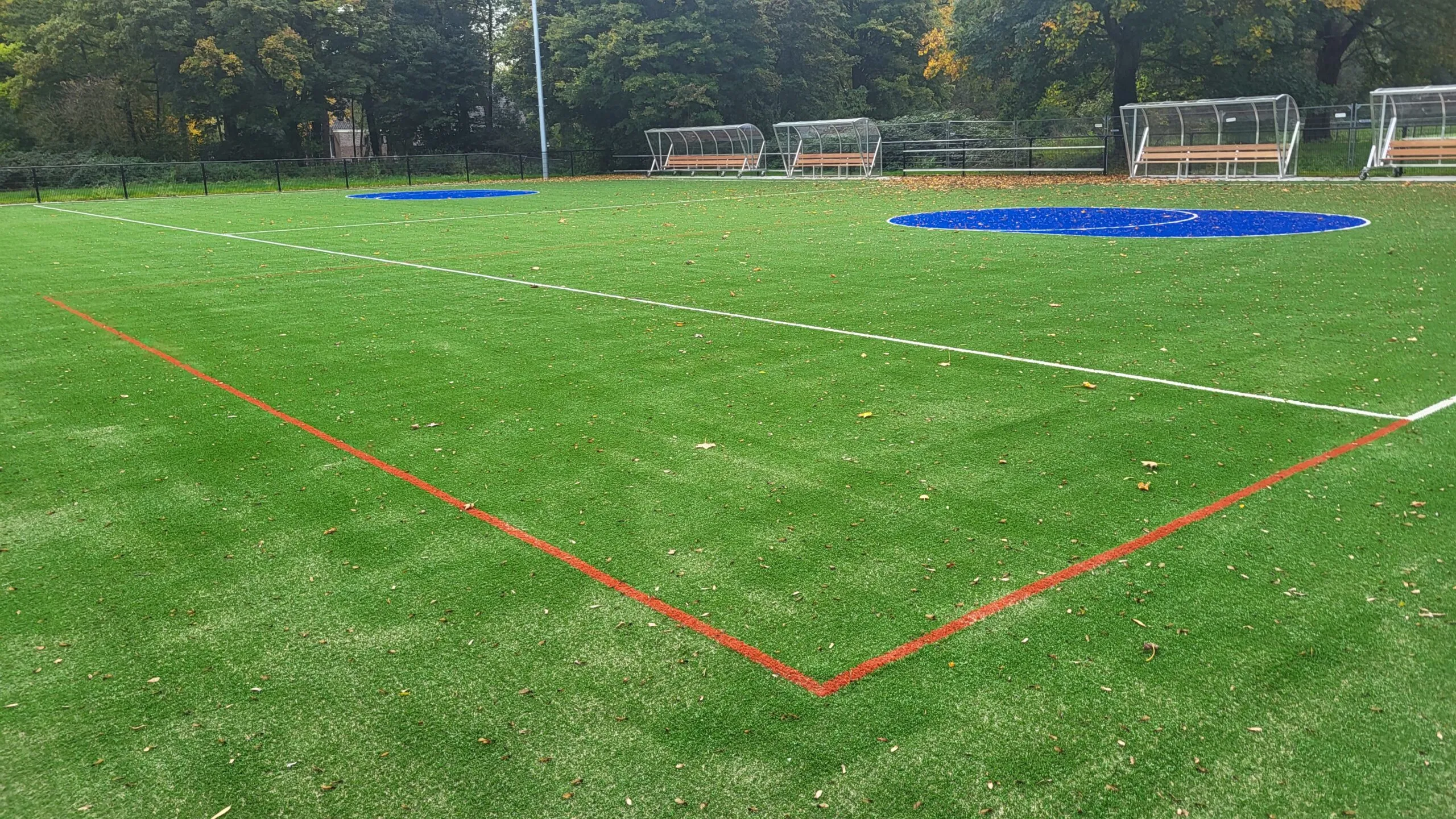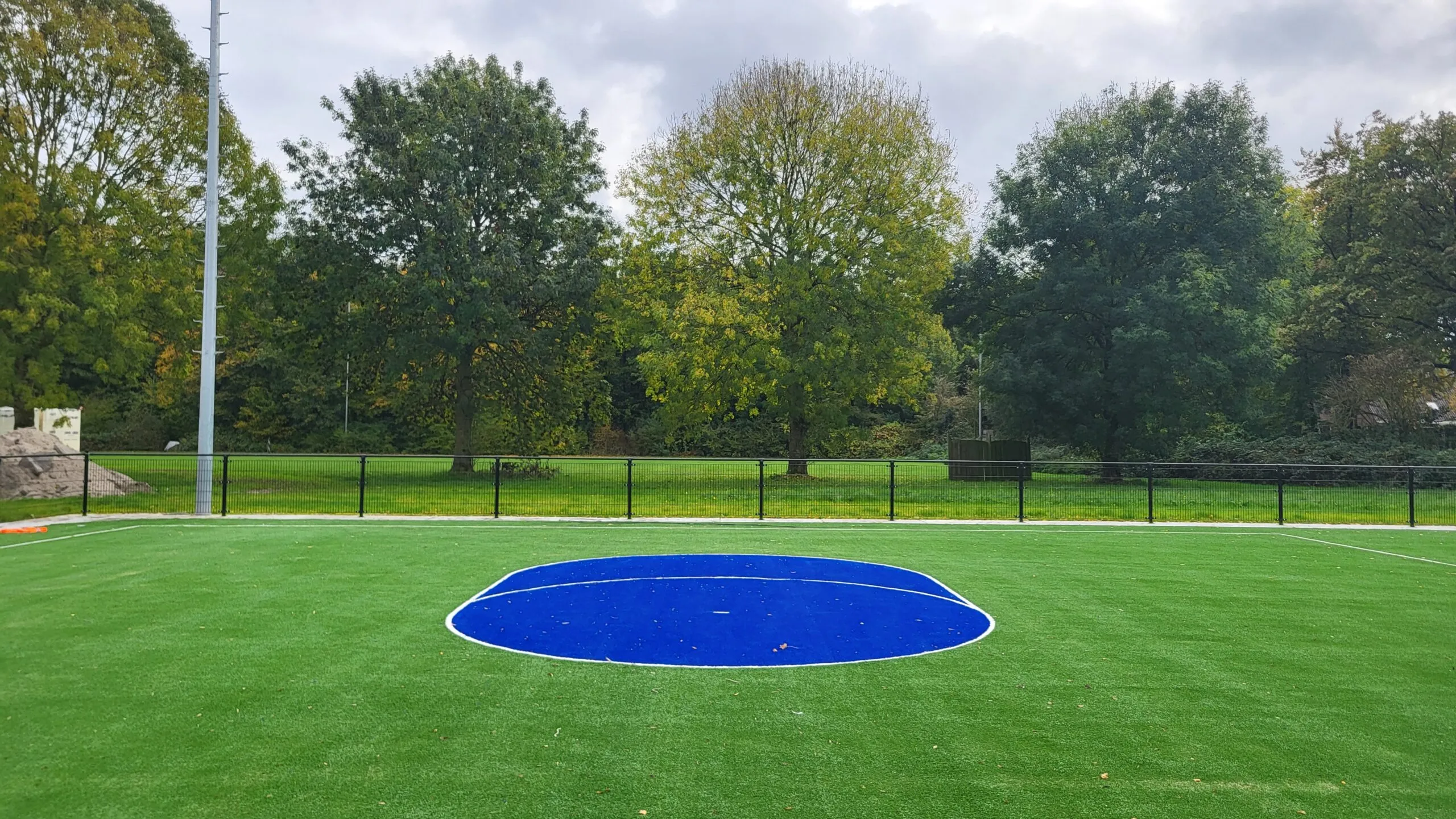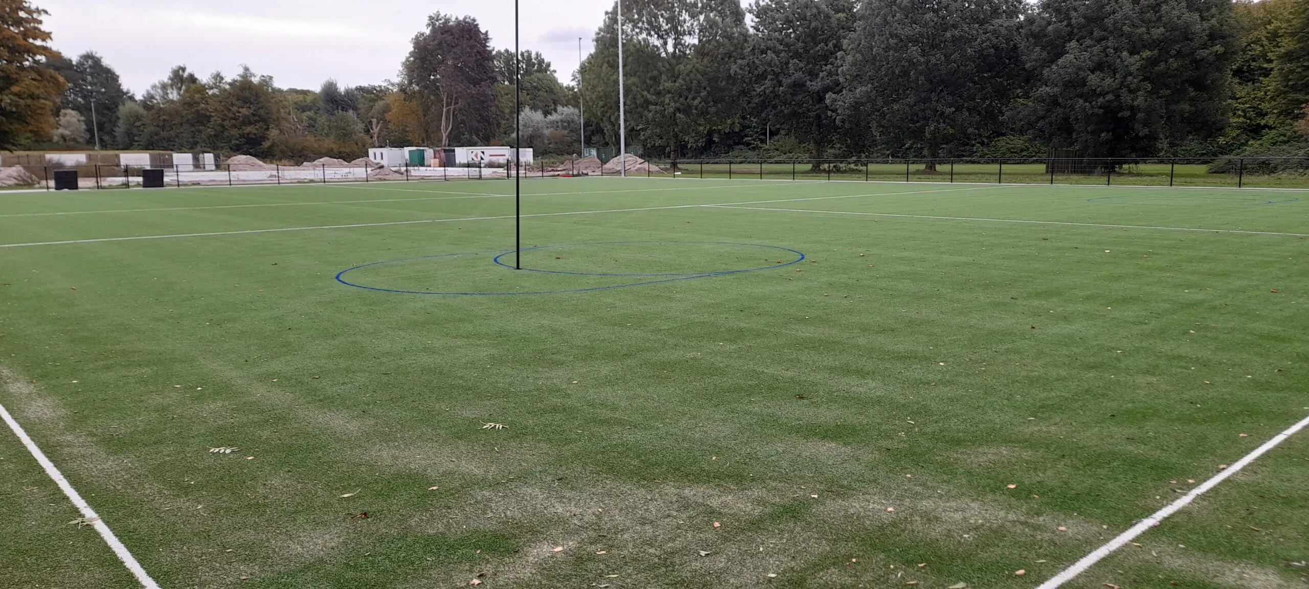 Inmiddels zijn we weer een aantal weken verder en is er veel gebeurt. De grote volledig blauwe cirkels rondom de korfzone en de belijning voor jeugdvelden zijn aangebracht in het kunstgrasveld.