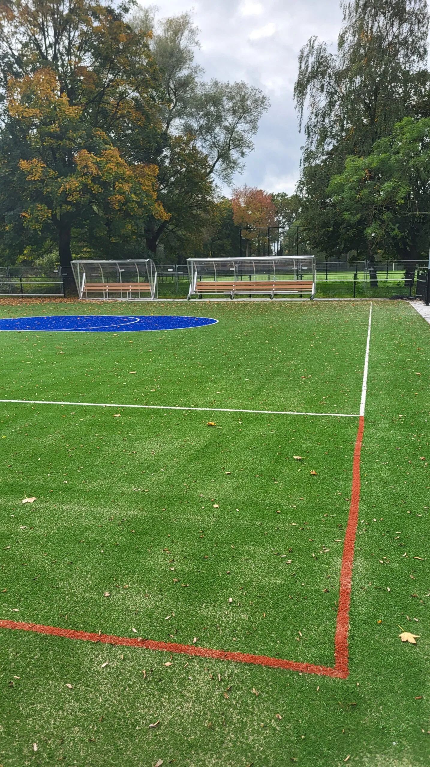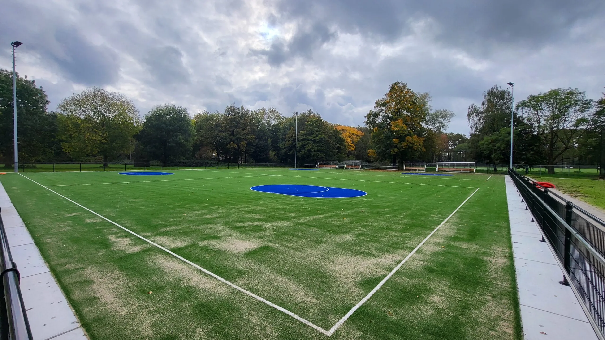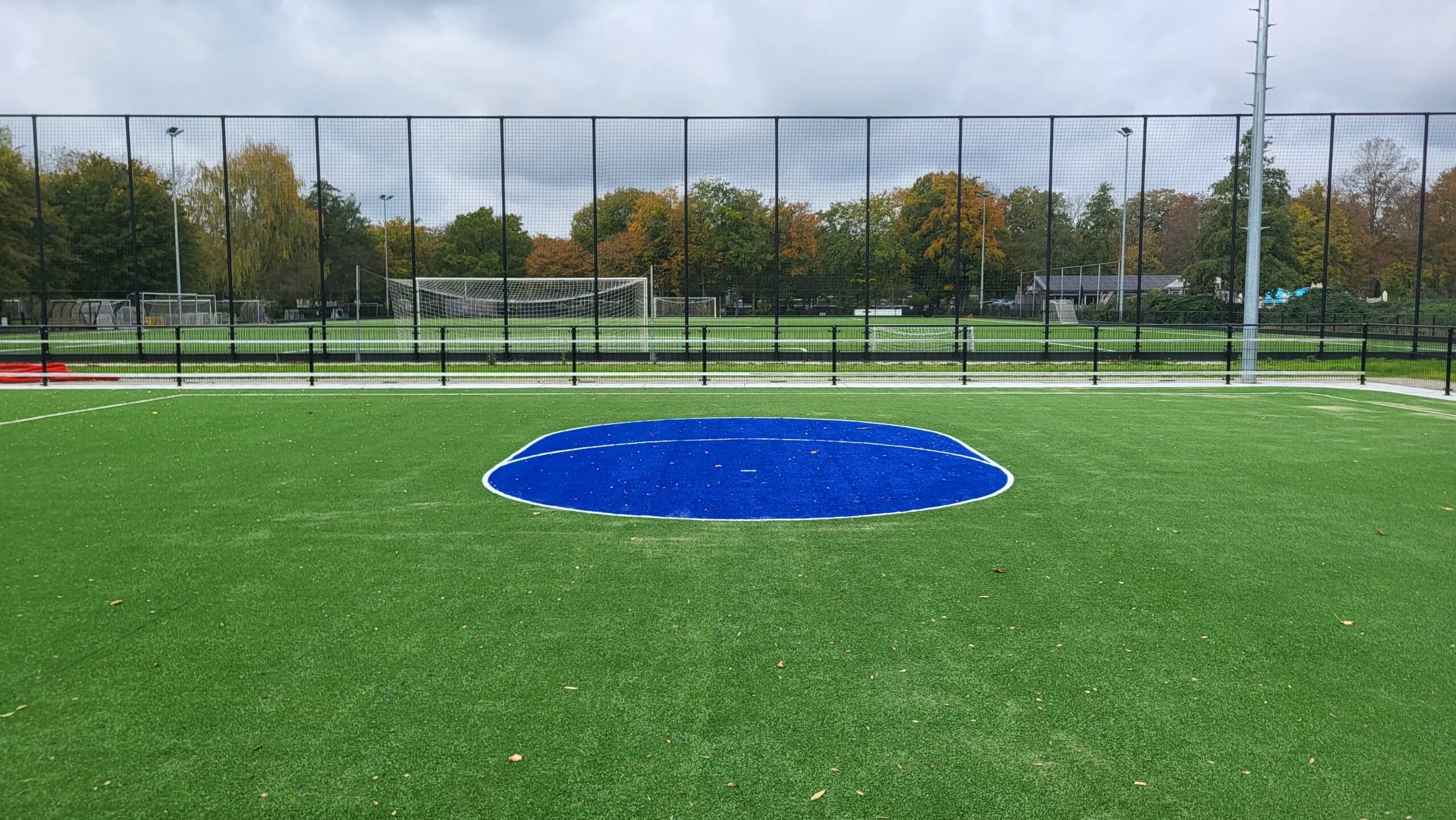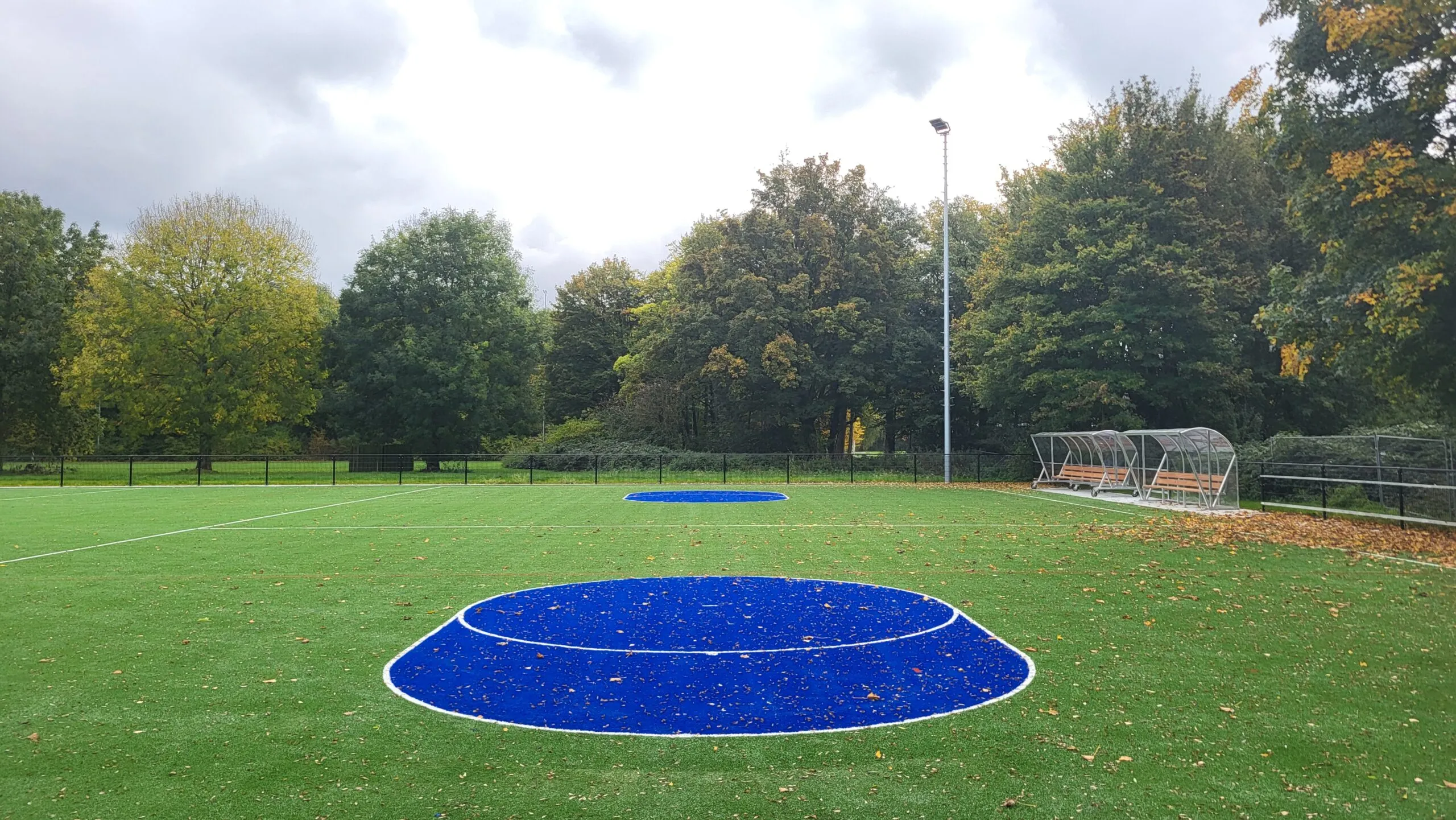 Inmiddels zijn we weer een aantal weken verder en is er veel gebeurt. De grote volledig blauwe cirkels rondom de korfzone en de belijning voor jeugdvelden zijn aangebracht in het kunstgrasveld.
