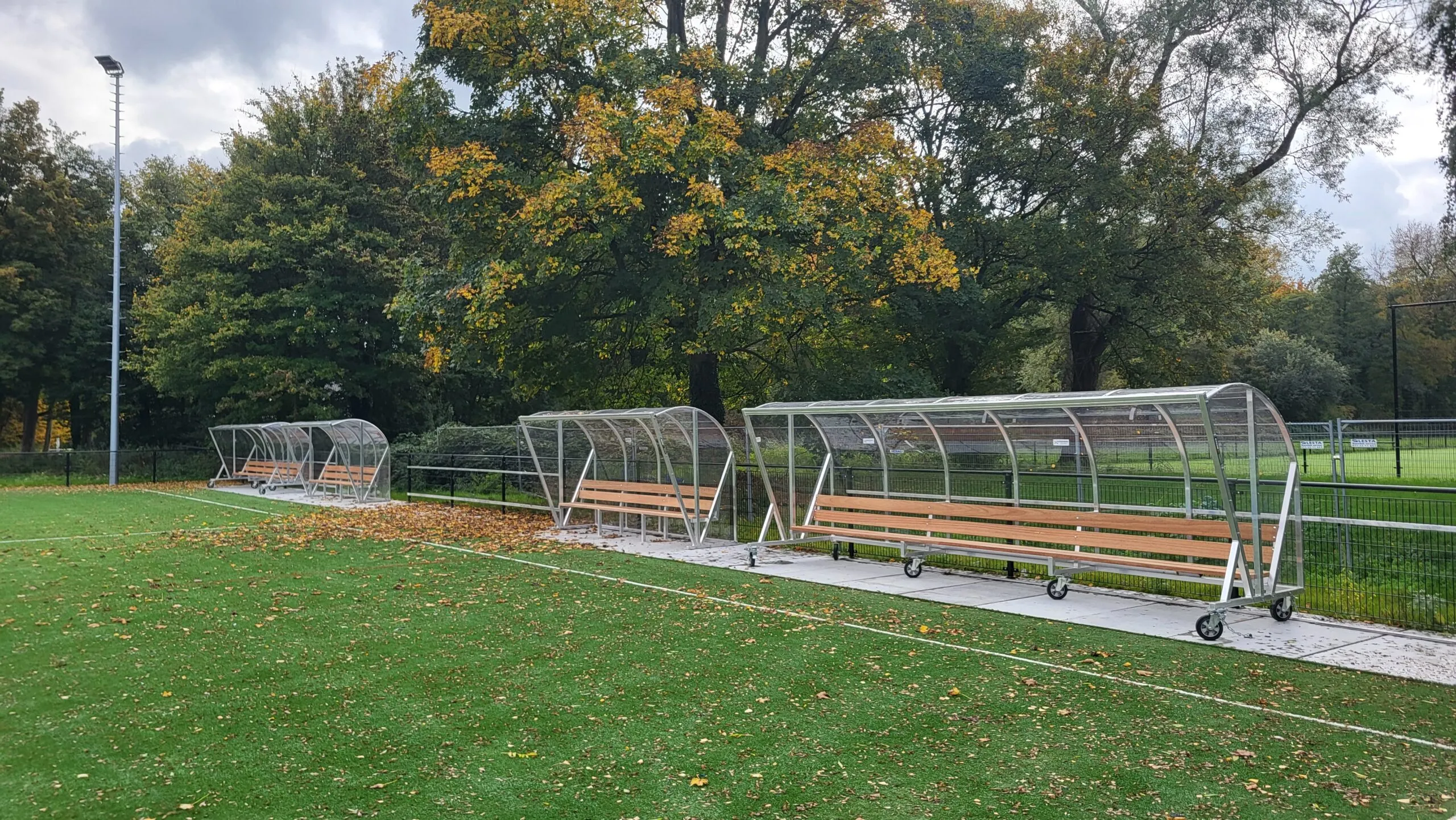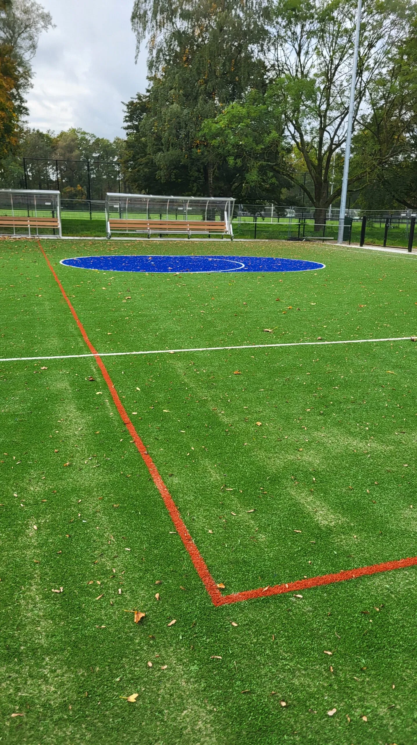 Er zijn grote stappen gemaakt sinds juni. De lichtmasten zijn geplaatst, evenals de hekken en het grootste deel van het kunstgrasveld. Wat nog ontbreekt zijn de grote volledig blauwe cirkels rondom de korfzone en de belijning voor jeugdvelden. De dugouts hebben al wel een plek gekregen. 2 vaste bij veld 2 en 2 verrijdbare voor veld 1.