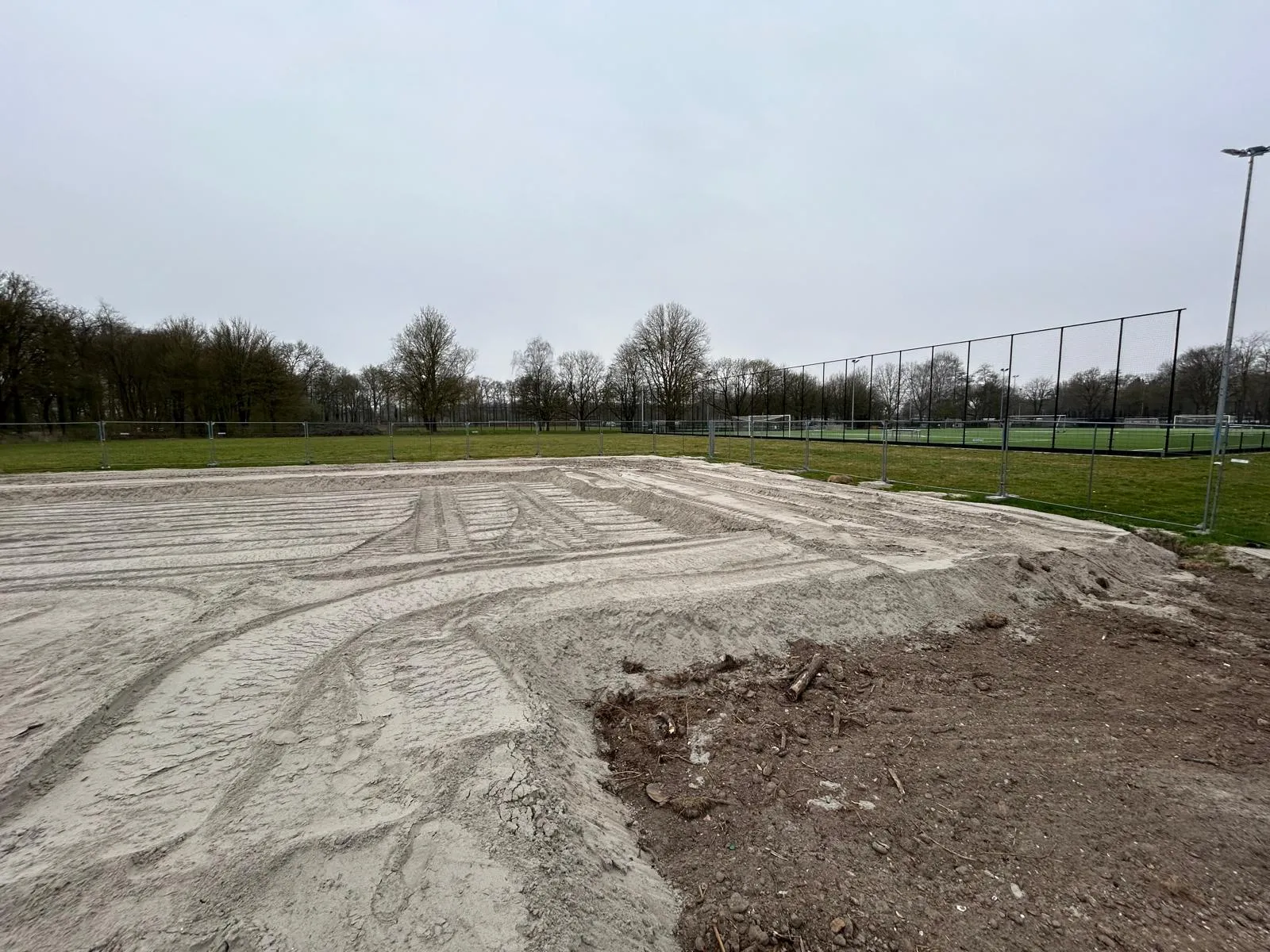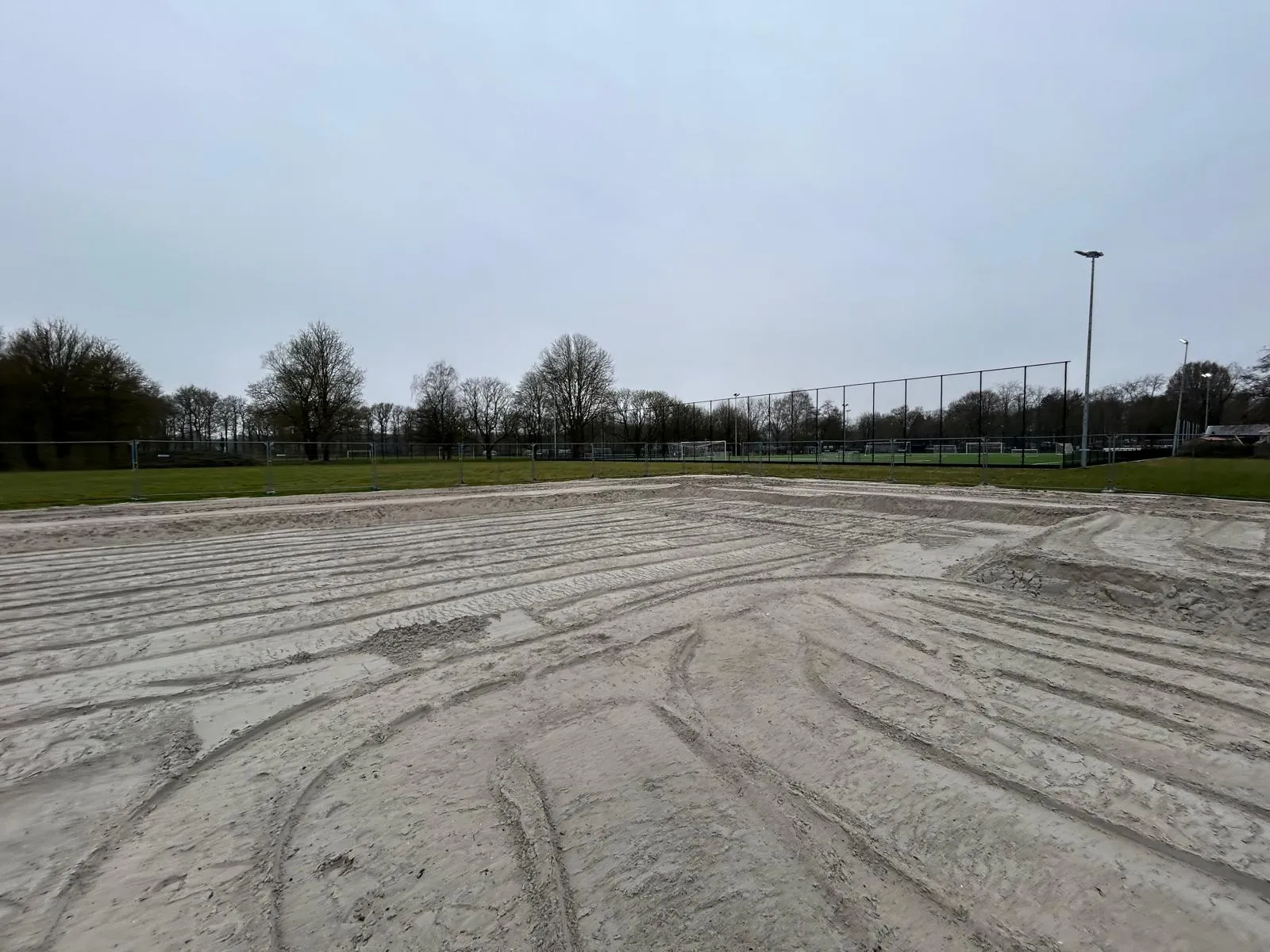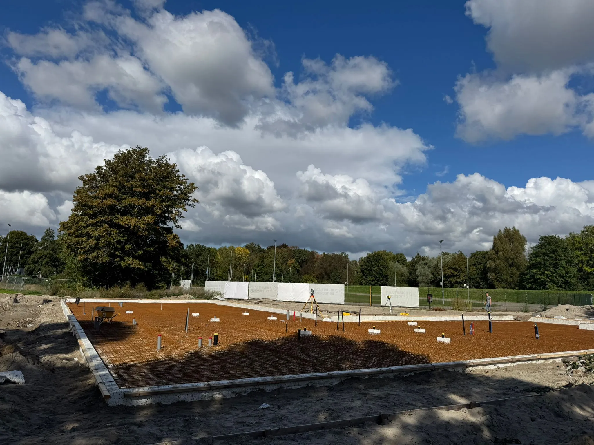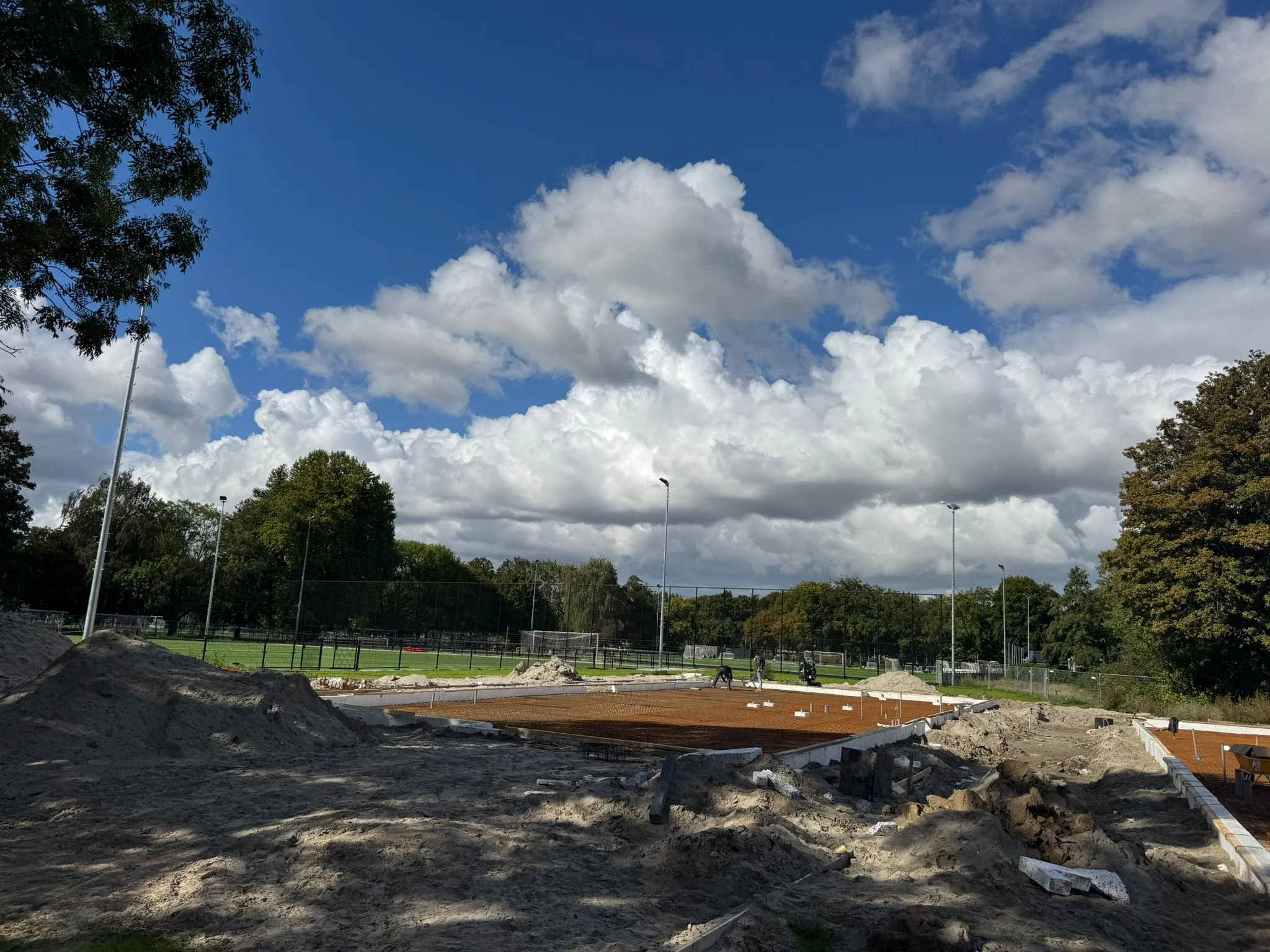 Afgelopen juni is de aannemer begonnen met het inrichten van de bouwplaats voor de bouw van het paviljoen. Tevens is de grond klaargemaakt voor de aanleg van het kunstgrasveld incl. lichtmasten en hekken.