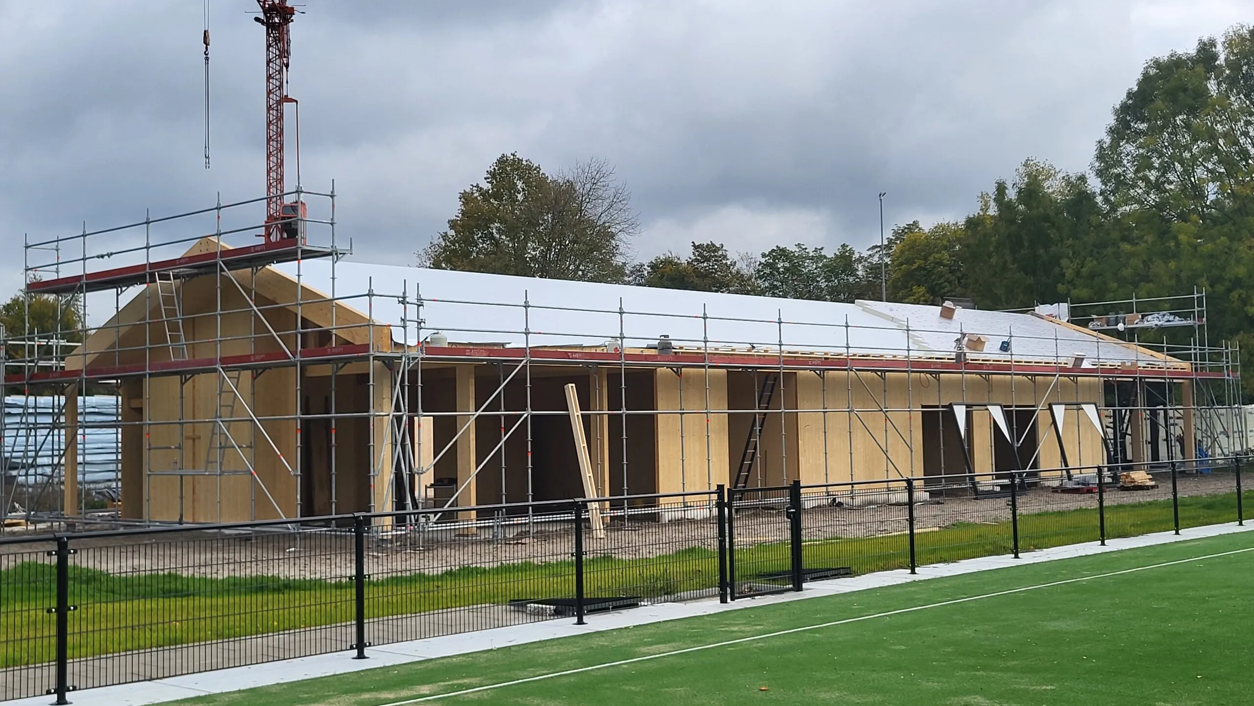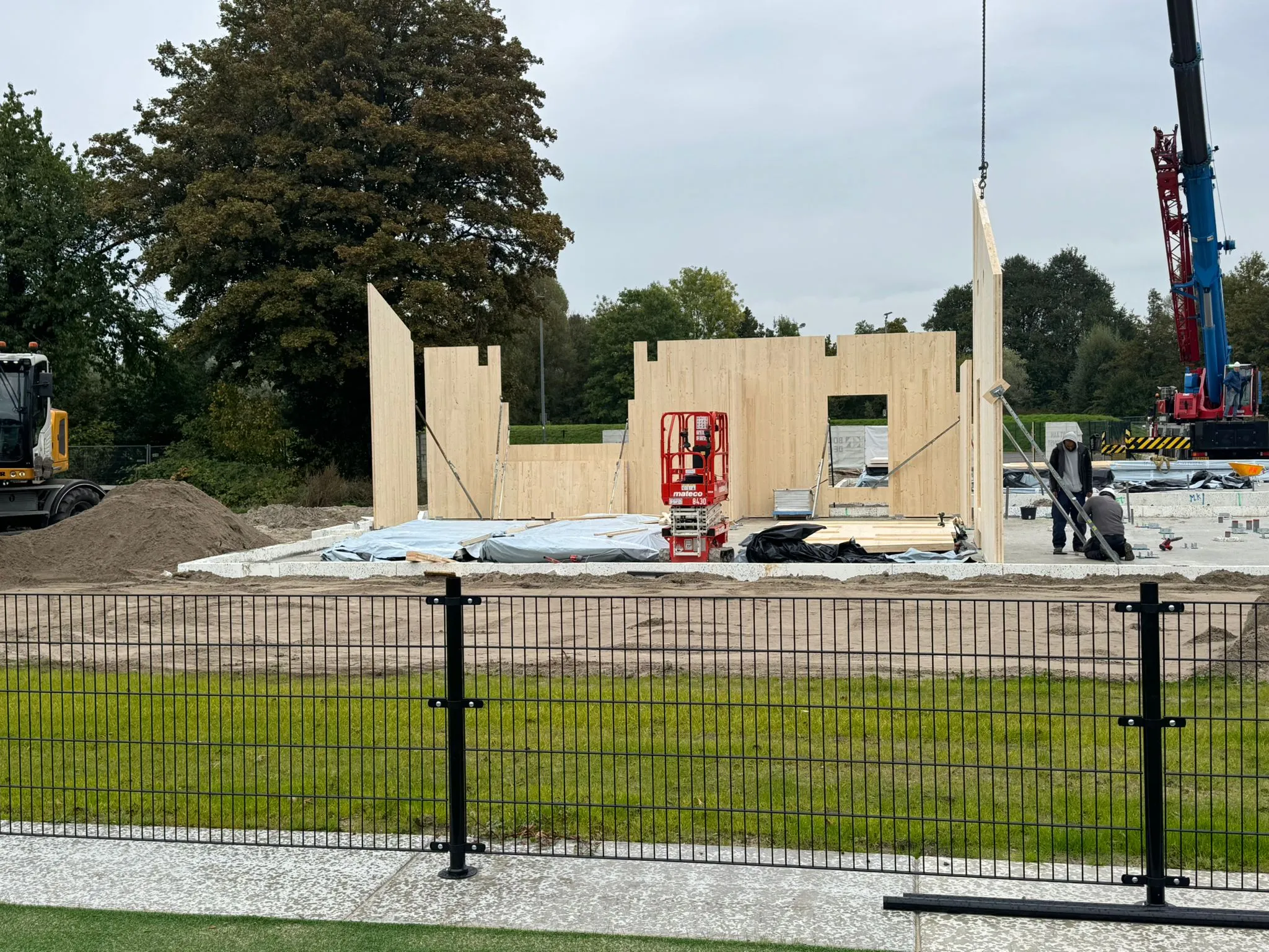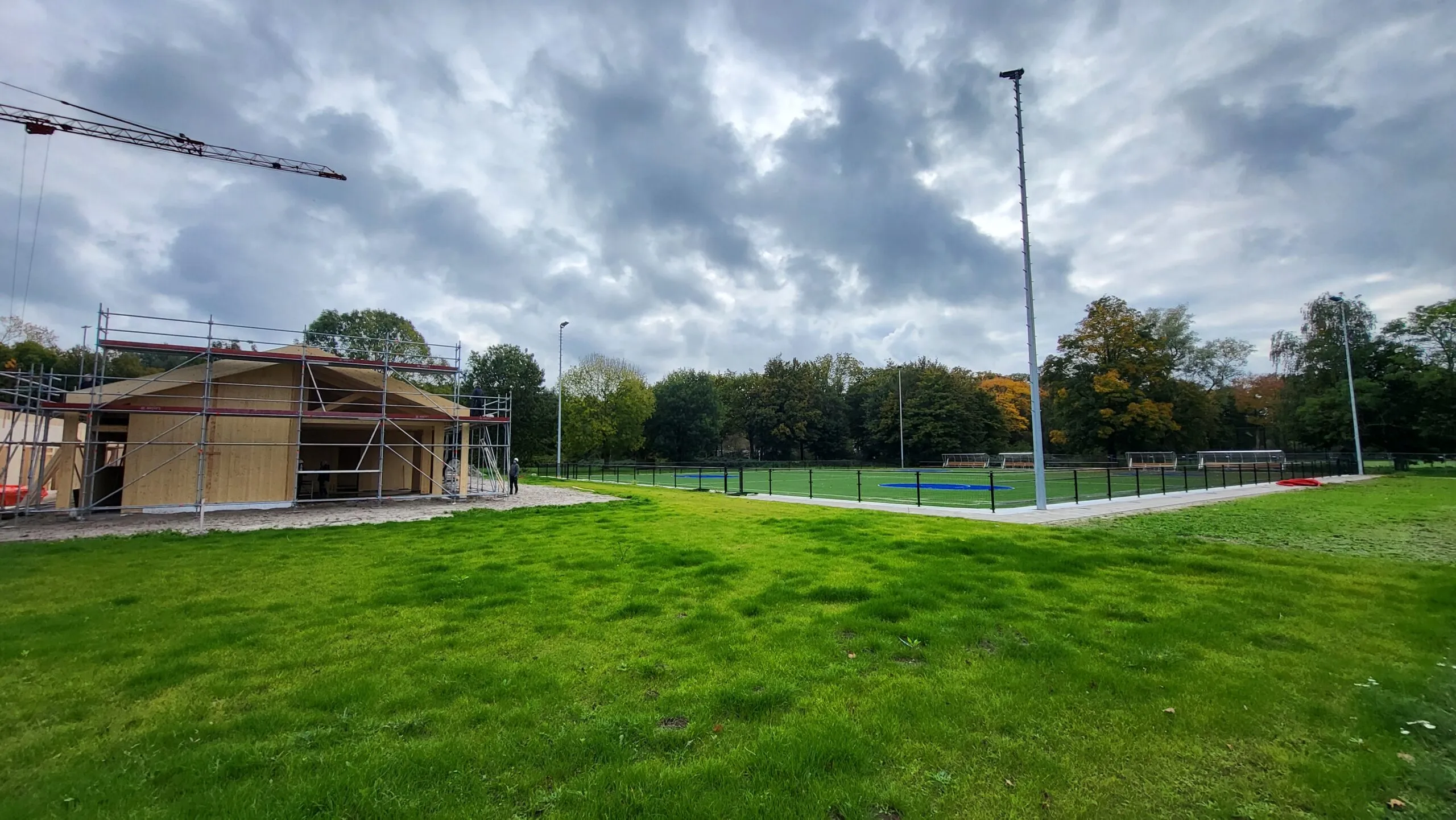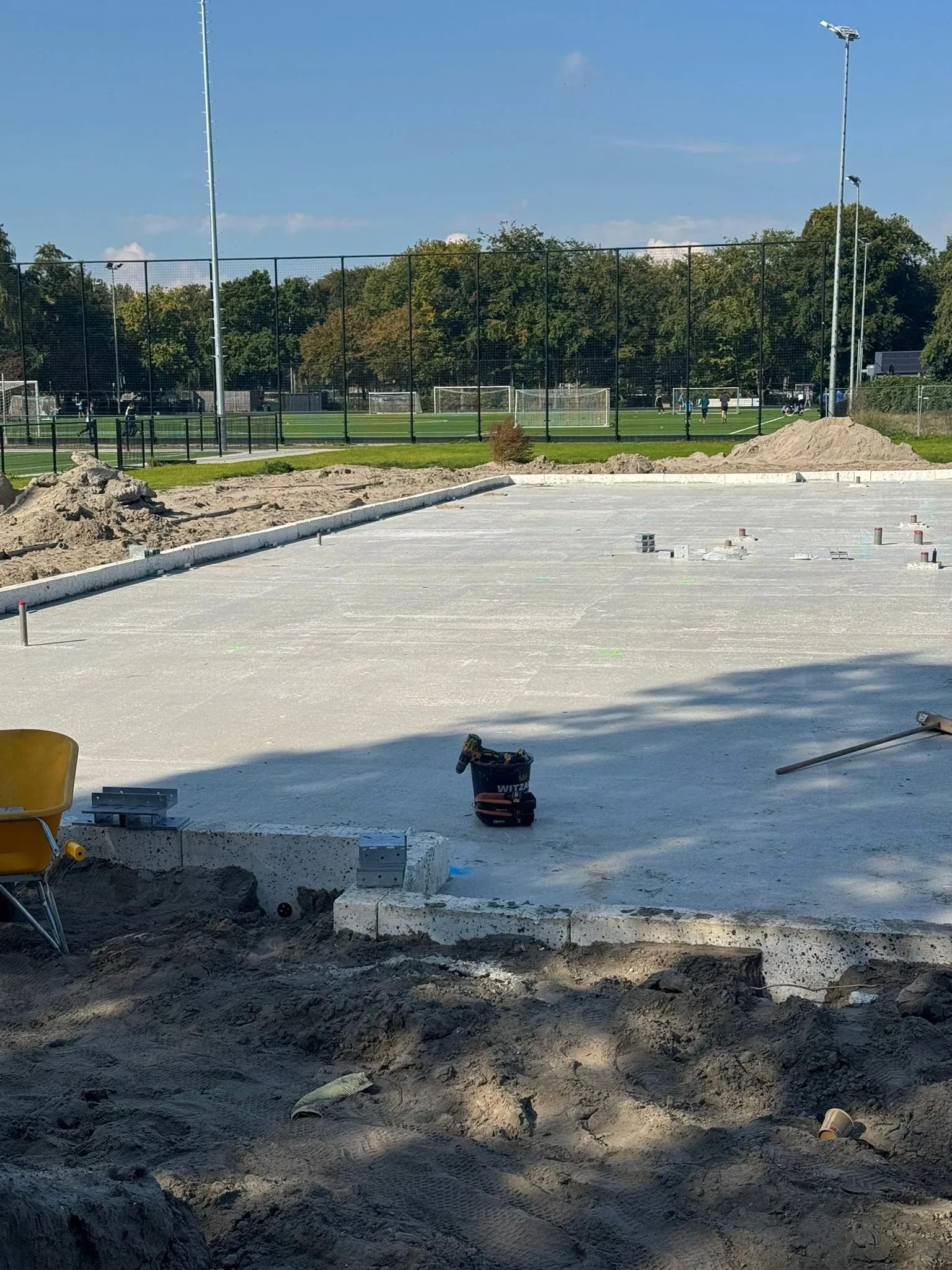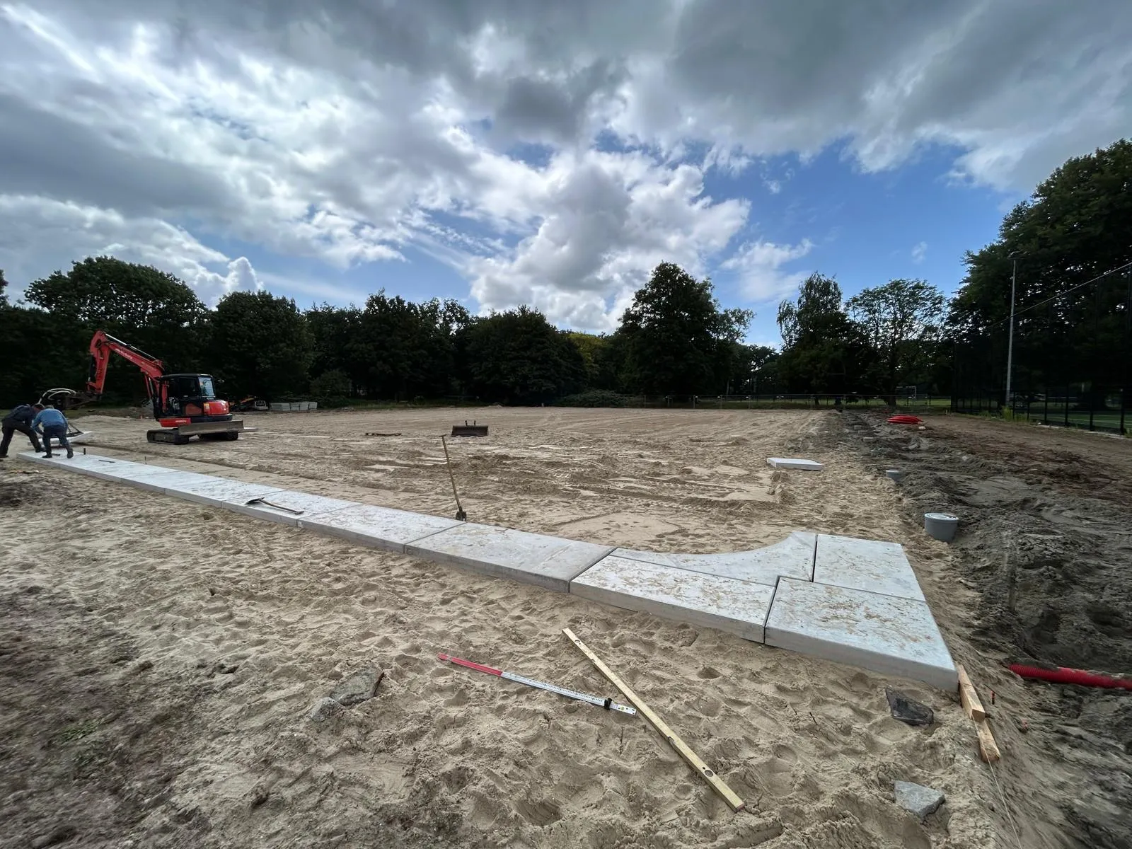 Afgelopen juni is de aannemer begonnen met het inrichten van de bouwplaats voor de bouw van het paviljoen. Tevens is de grond klaargemaakt voor de aanleg van het kunstgrasveld incl. lichtmasten en hekken.