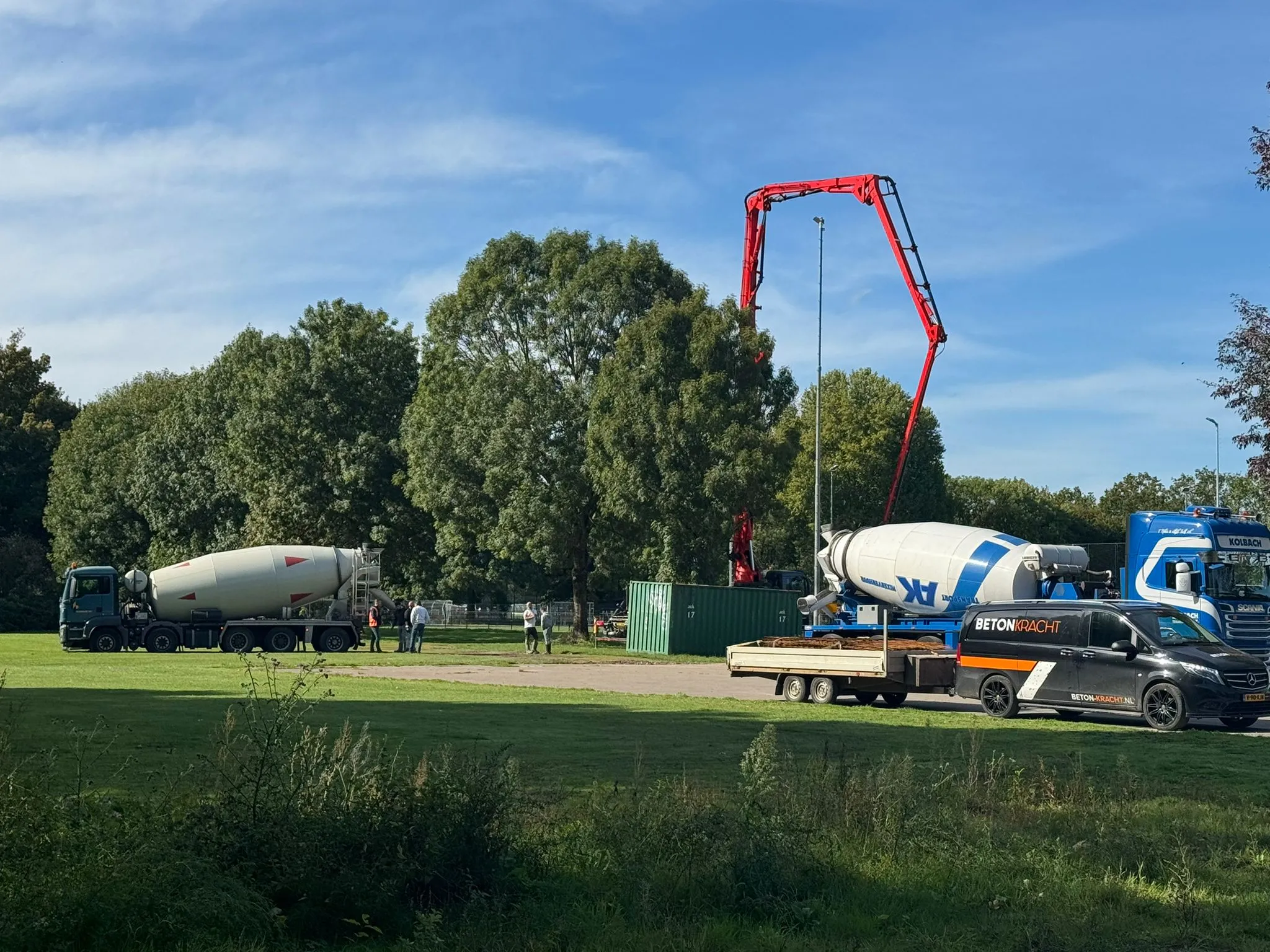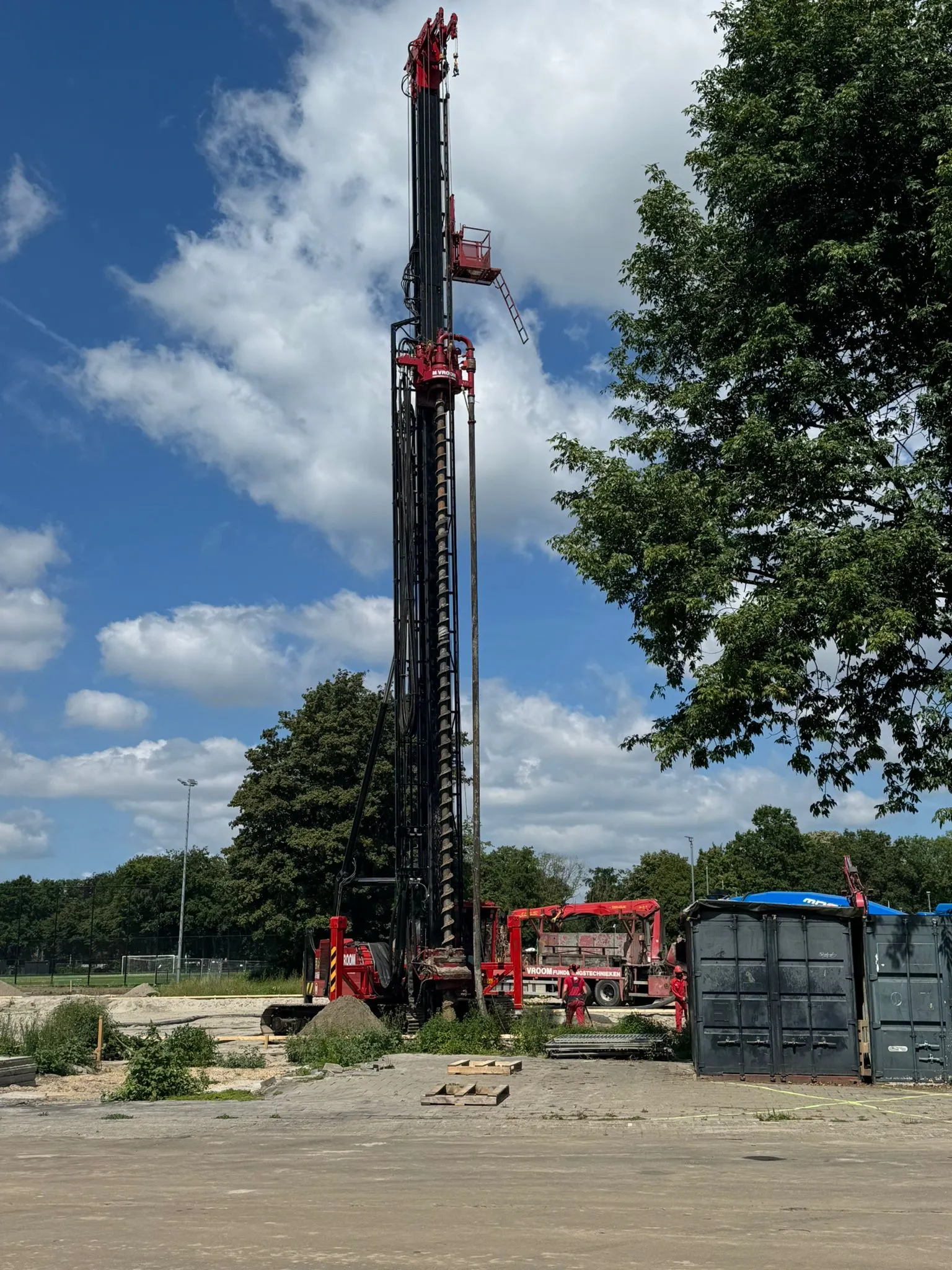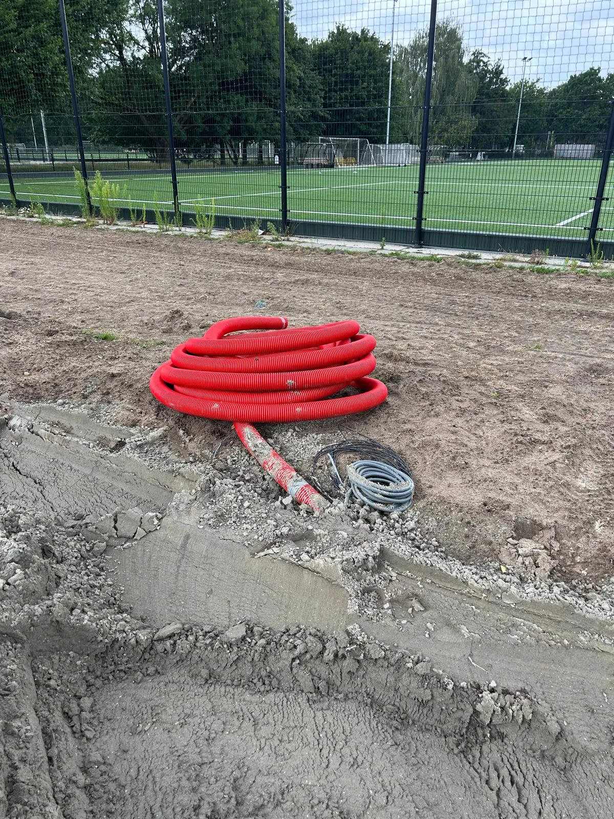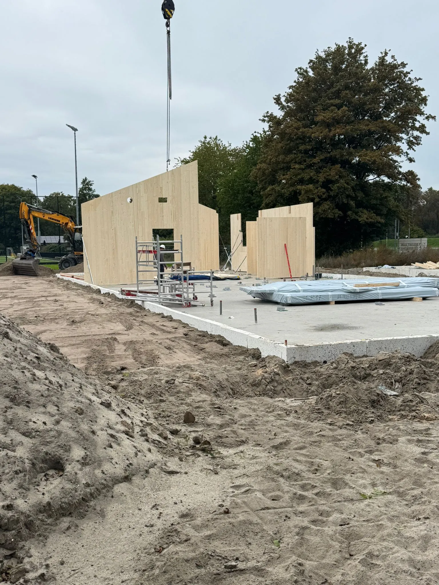 Afgelopen juni is de aannemer begonnen met het inrichten van de bouwplaats voor de bouw van het paviljoen. Tevens is de grond klaargemaakt voor de aanleg van het kunstgrasveld incl. lichtmasten en hekken.