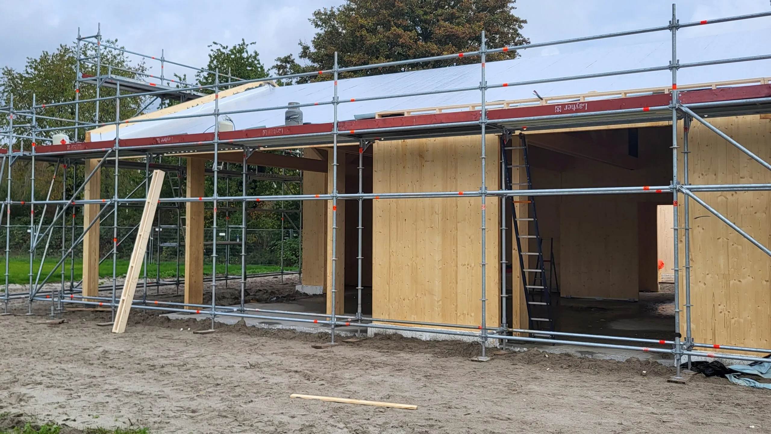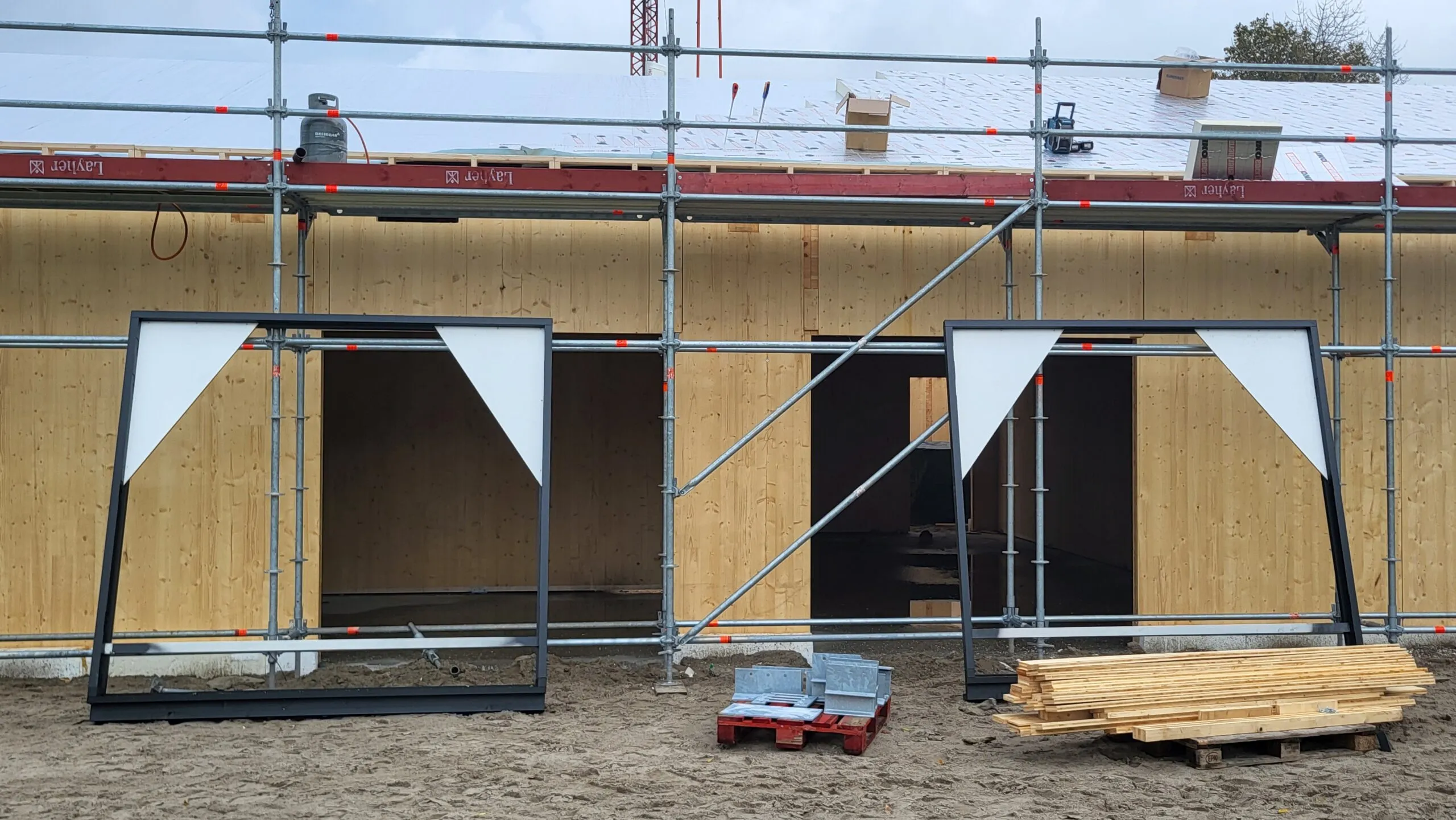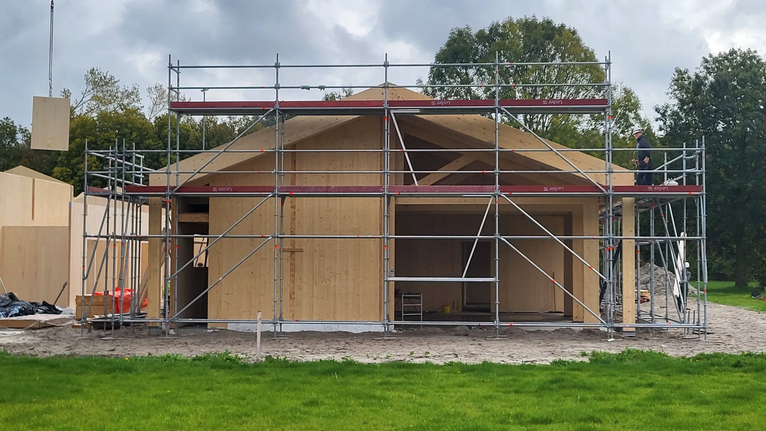 De bouw van het paviljoen gaat nu heel snel. De CLT-wanden zijn geplaatst. Ook met het dak zijn ze al ver gevorderd. Een deel van de kozijnen staan al klaar om binnenkort geplaatst te worden. Het paviljoen begint nu echt vorm te krijgen!