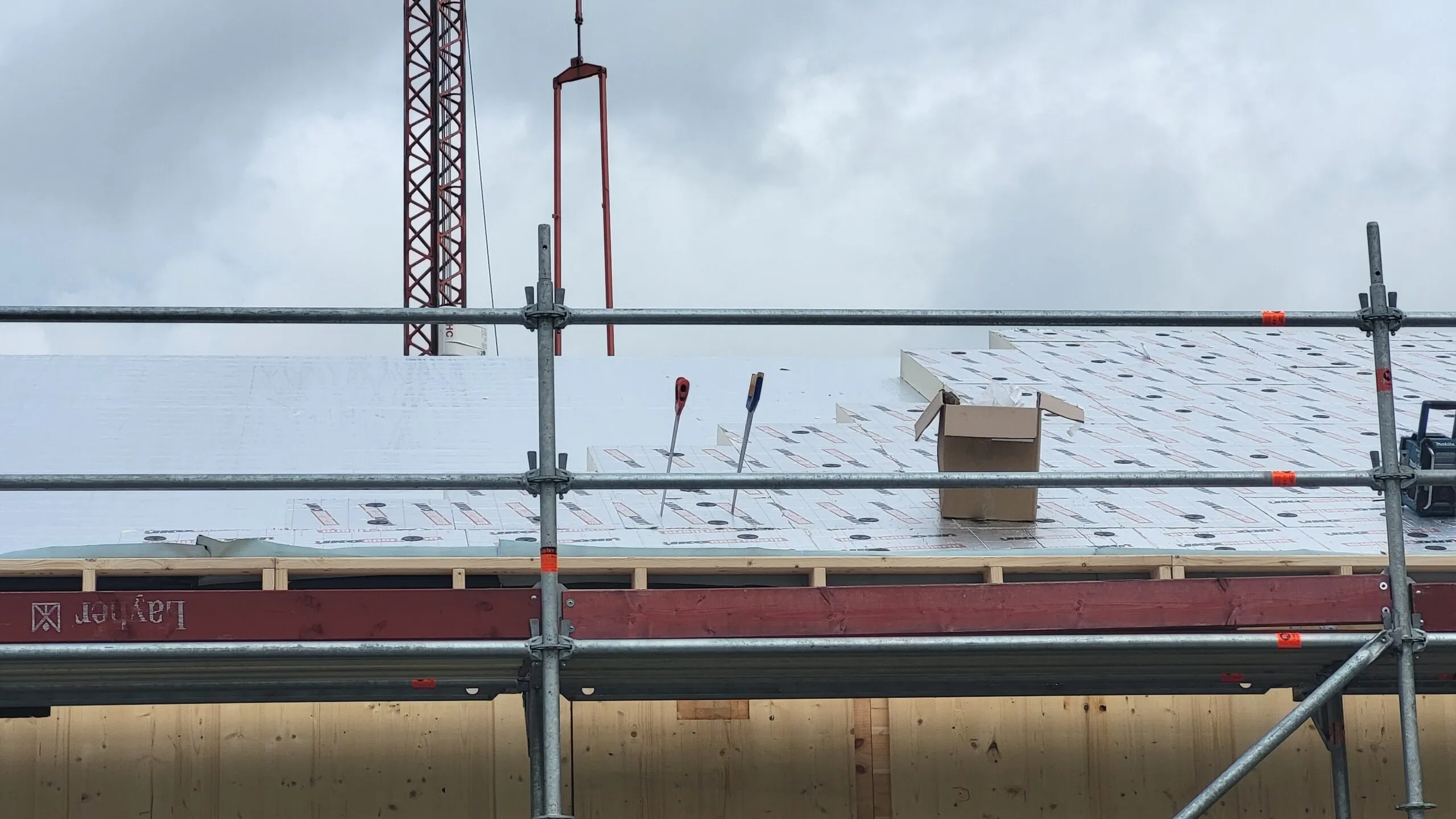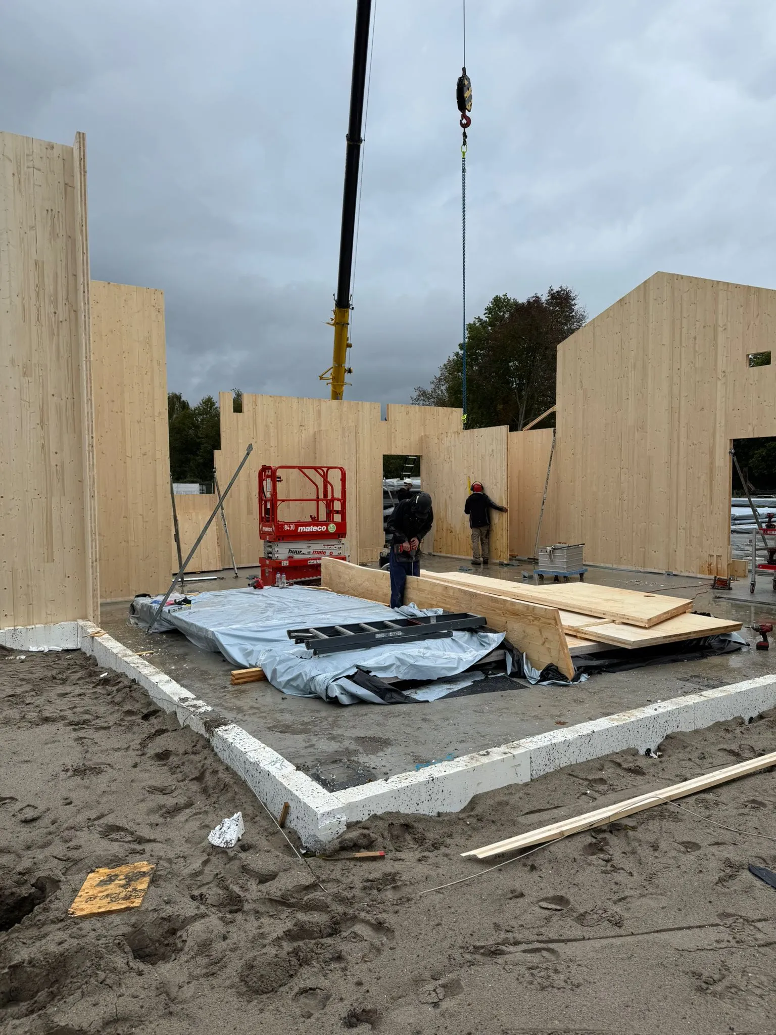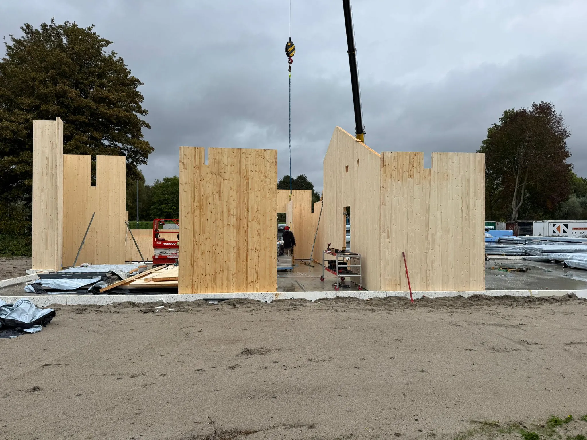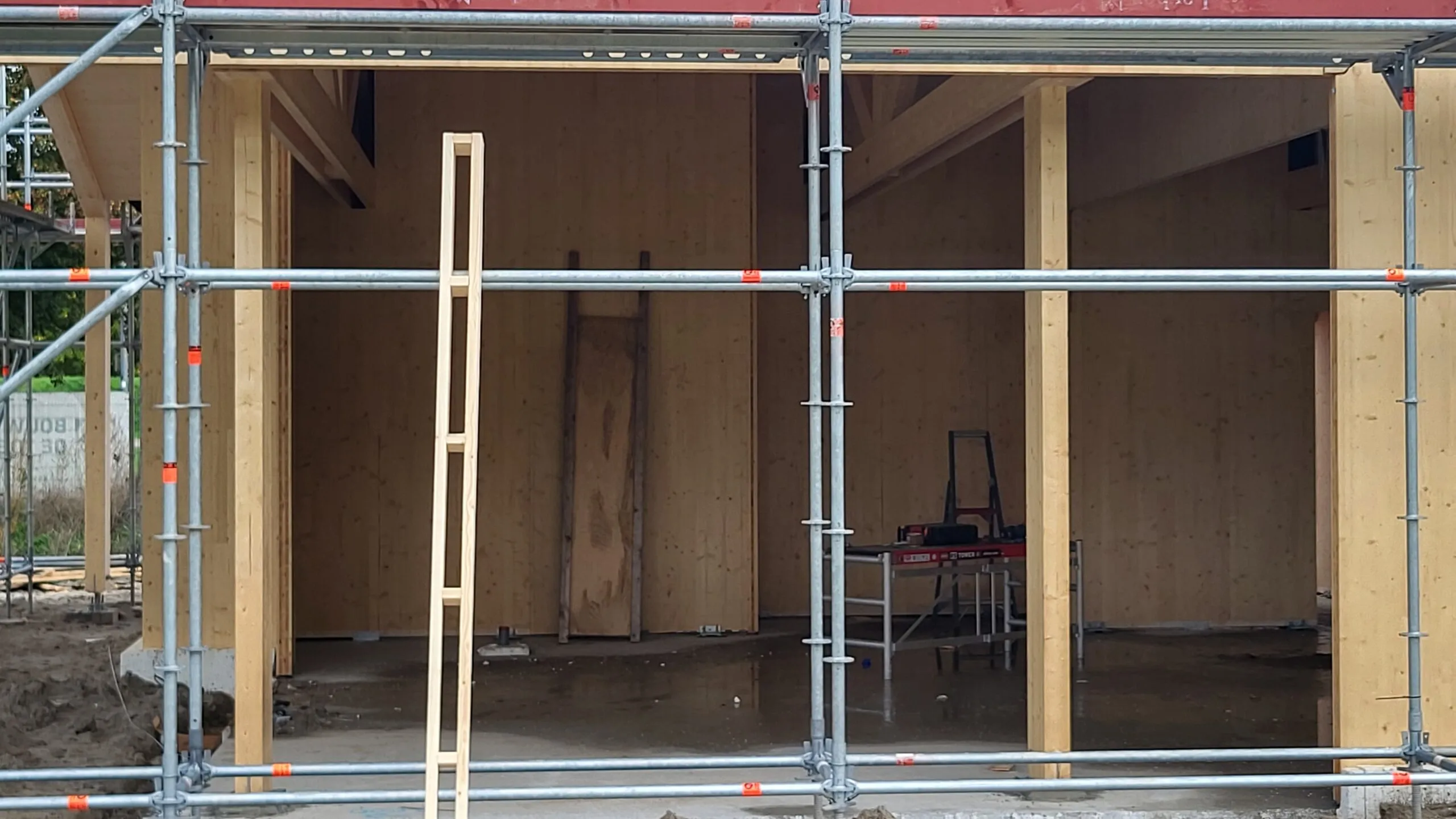 De bouw van het paviljoen gaat nu heel snel. De CLT-wanden zijn geplaatst. Ook met het dak zijn ze al ver gevorderd. Een deel van de kozijnen staan al klaar om binnenkort geplaatst te worden. Het paviljoen begint nu echt vorm te krijgen!
